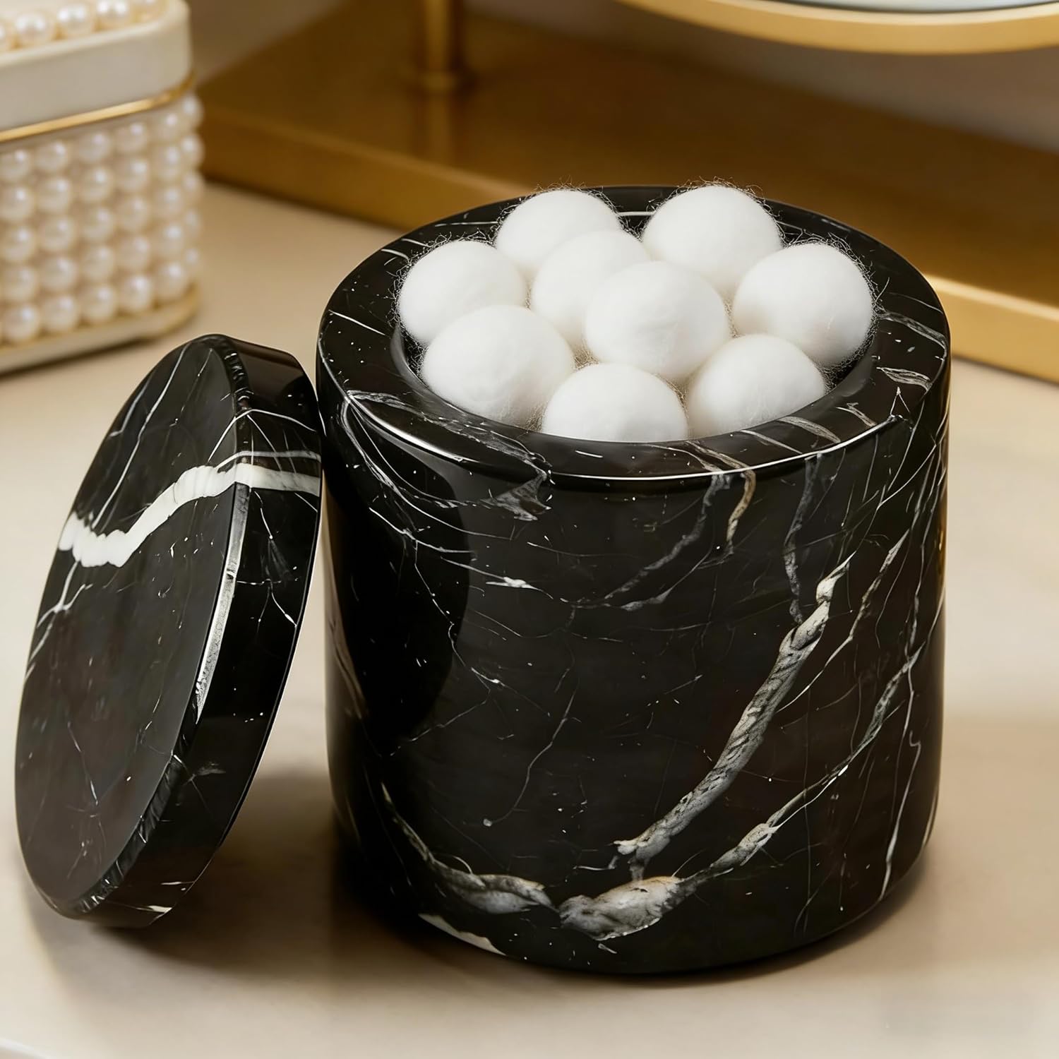 Natural black marble canister are elegant and luxurious additions to any bathroom.Large Black Marble CanisterOverall:3.75" dia. x 4.5"H.Made from high-quality black marble, it add a touch of sophistication and timeless beauty to your space.The natural veining and unique patterns in the marble make each piece one-of-a-kind.Variation in veining and activity of marble is to be expected; each will be unique.Not only are they stylish, but they are also durable and easy to clean, making them both functional and aesthetically pleasing.Whether you are going for a modern or traditional look in your bathroom, natural black marble canister is sure to elevate the overall ambiance.Note: There may be dust on the product when you receive it. You need to rinse it with clean water and wipe it, and the product will look brand new.