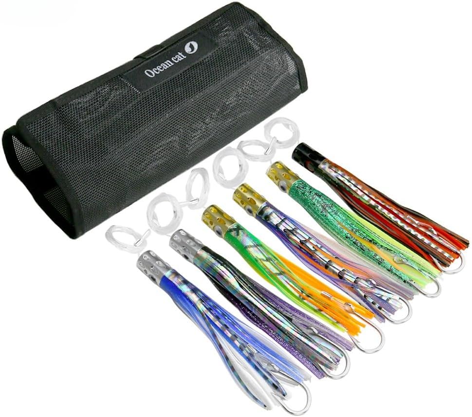 OCEAN CAT Set of 6 pcs 6 inches Jet Head Hoochie Octopus Squid Skirts Fishing Lures Trolling Lures for Tuna Marlin Dolphin Mahi Wahoo and Dorado Saltwater Fishing with Rigged Hooks Free Mesh Bag